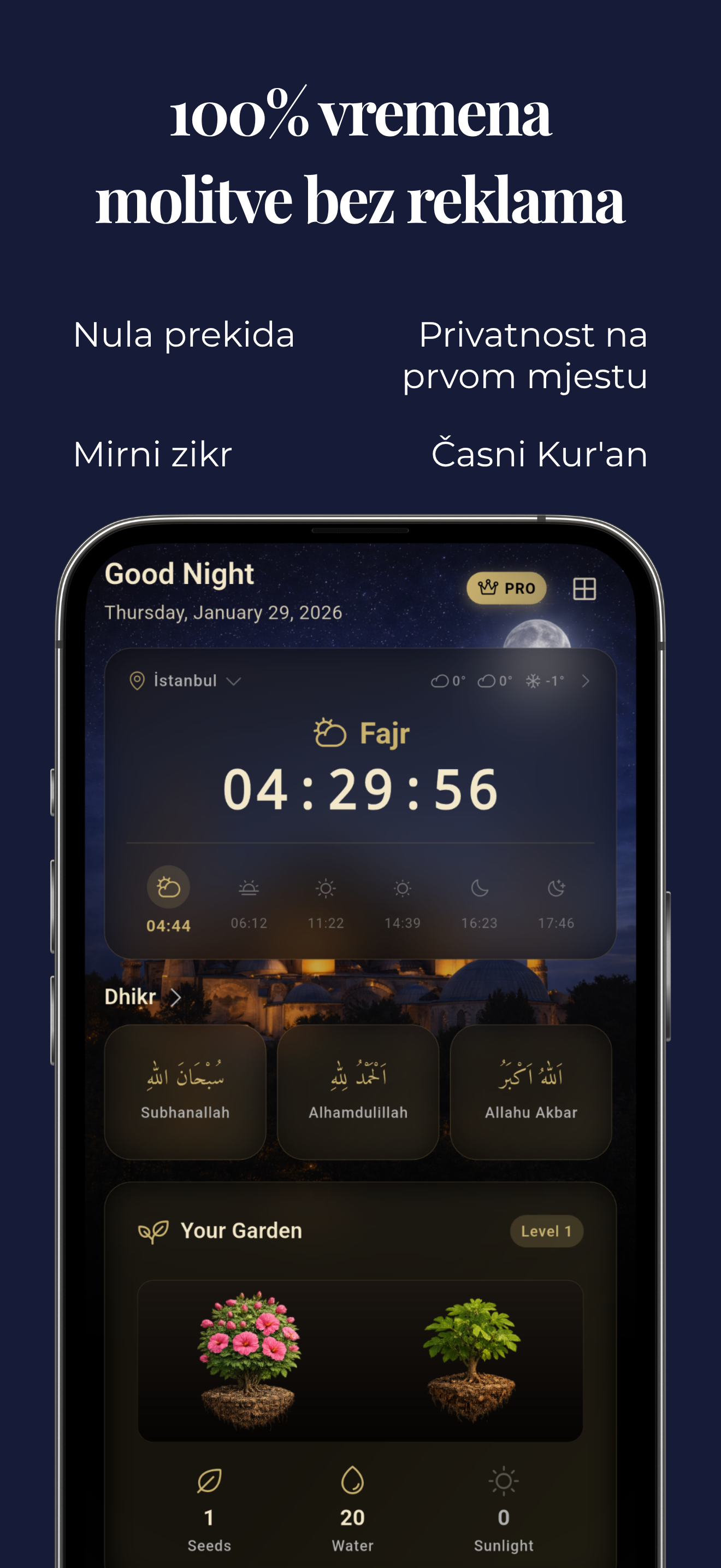 Vaši ibadet podaci (zikrovi, bašta, namazi) čuvaju se lokalno na uređaju. Ne pristupamo vašim podacima niti ih dijelimo. Vaš duhovni put je privatan - između vas i Allaha.