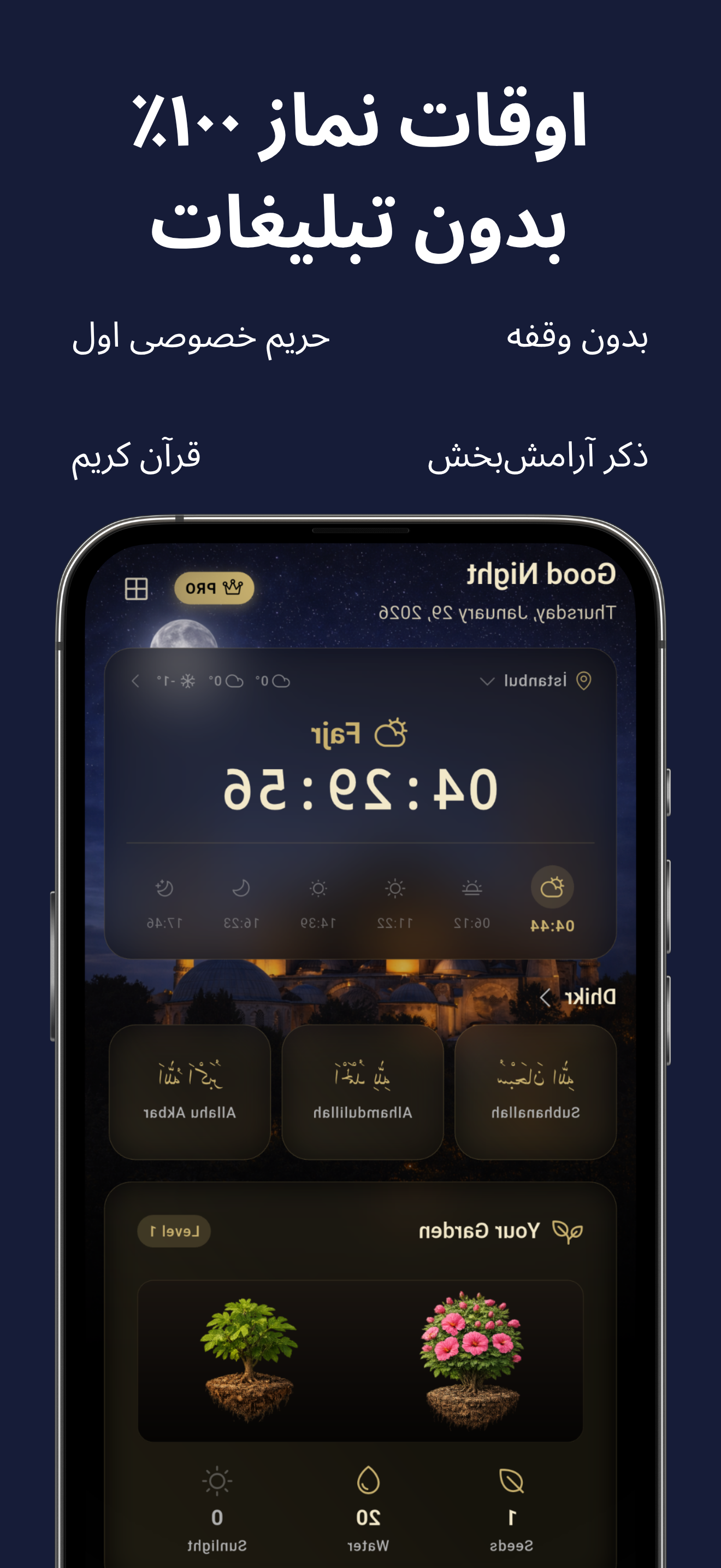 دادههای عبادی شما (تعداد ذکر، باغ و نماز) فقط روی گوشی ذخیره میشود. ما به آنها دسترسی نداریم و آنها را با کسی به اشتراک نمیگذاریم. سفر معنوی شما بین شما و خدا خصوصی میماند.