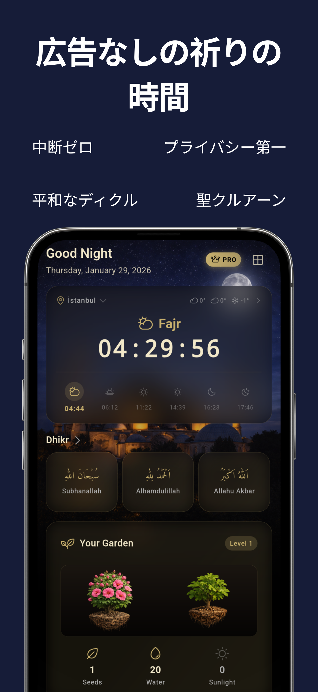 あなたの崇拝データ(回数、庭の進捗、記録)はデバイス内にのみ保存されます。私たちはデータにアクセスも共有もしません。あなたの信仰の旅は、あなたとアッラーの間だけの神聖な秘密です。