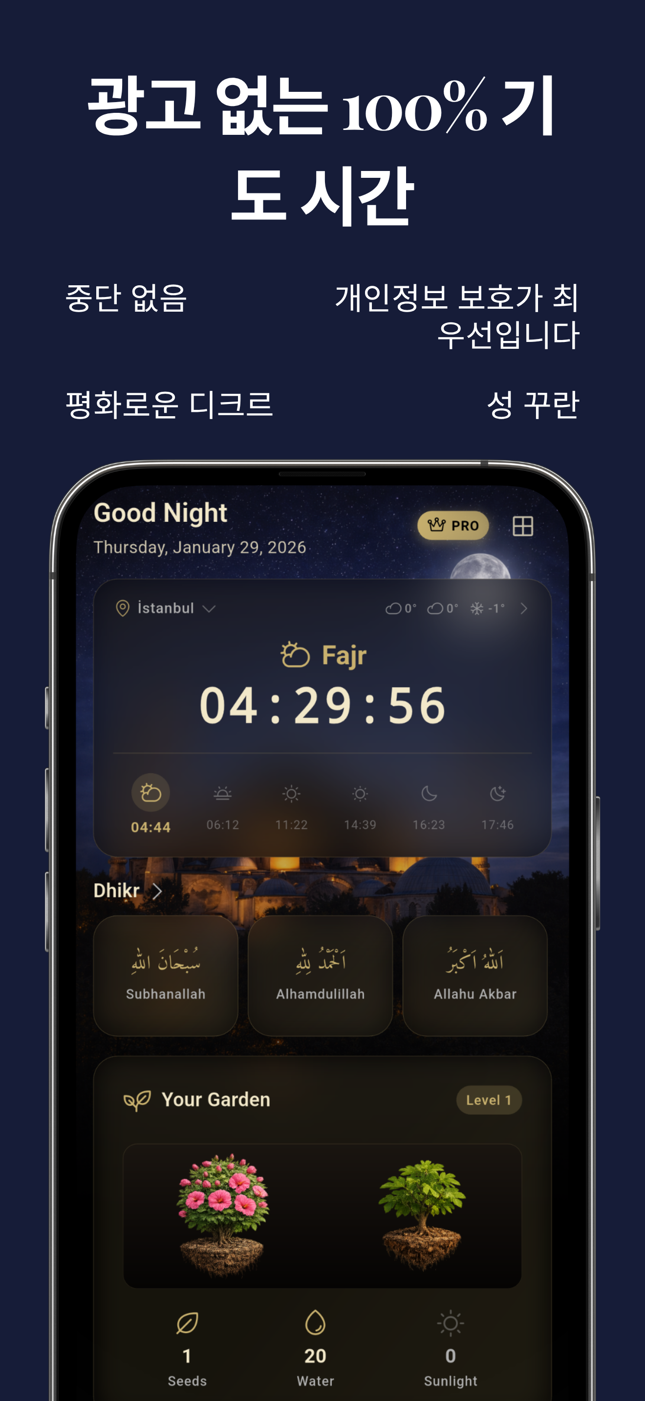 짧은 꾸란 구절, 하디스 리마인더, 아즈카르, 실천 습관을 나누어 부담 없이 꾸준함을 돕습니다.