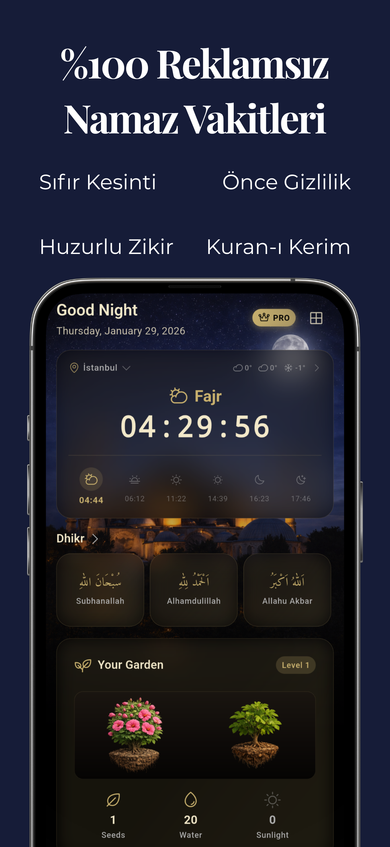 İbadetiniz, sizinle Allah arasındadır. Bu yüzden "Önce Mahremiyet" yaklaşımını benimsiyoruz: Namaz geçmişiniz, zikir sayılarınız ve manevi ilerlemeniz sadece cihazınızda kalır. Alışkanlıklarınızı takip etmiyor veya verilerinizi reklam ağlarıyla paylaşmıyoruz. Tasarımımız, ibadet veya tefekkür anlarınızı hiçbir şeyin bölmemesi için kasıtlı olarak sade ve dikkat dağıtmayan bir yapıda hazırlandı.